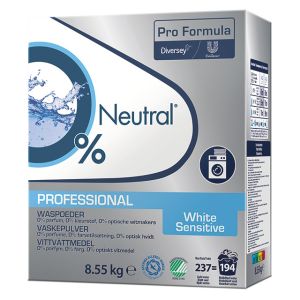 Neutral Professional vittvättmedel 8,55 kg är ett pulvertvättmedel för professionella användare, särskilt utvecklat för personer med känslig hud - för att minska risken för allergi och överkänslighet. Tvättmedlet är parfymfritt och innehåller inga färgämnen.